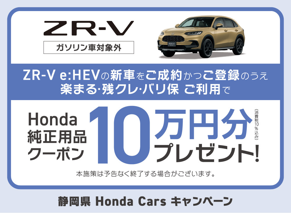 ●ZR-V e:HEVを新車でご成約かつご登録のうえ、楽まる(楽らくまるごとプラン)・残クレ(残価設定型クレジット)・バリ保(バリュー保証プラン)のいずれかをご利用いただいた方が対象となります。