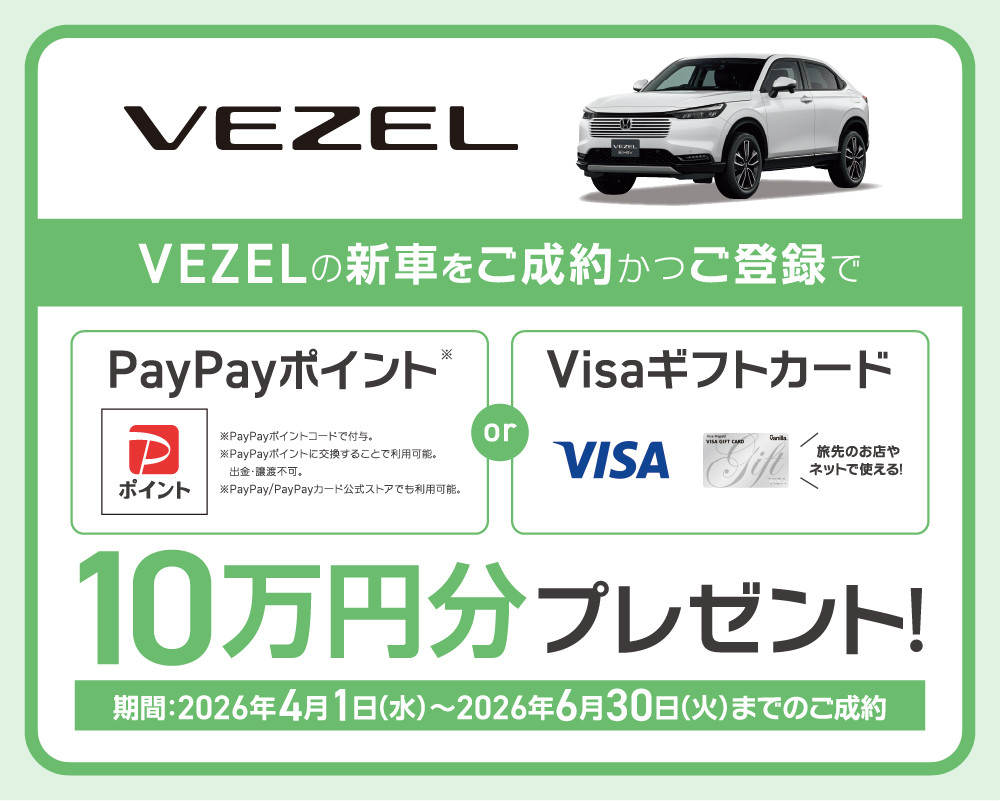 VEZELの新車をご成約かつご登録でPayPayポイント or Visaギフトカード10万円分プレゼント!